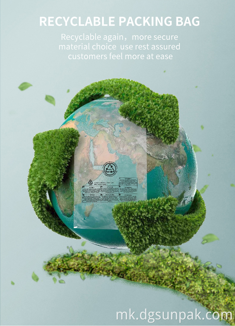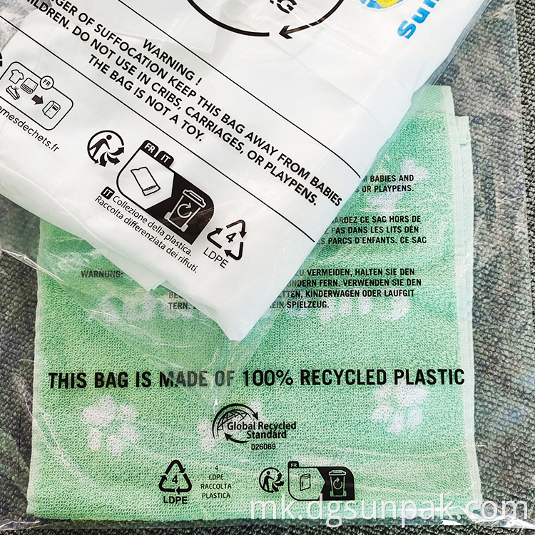 * Polybag е мешавина од 30% или 50% или 70% материјал што може да се рециклира, остатокот нов материјал, 100% рециклиран значи дека целиот материјал е материјал што може да се рециклира, LDPE, HDPE, PPE, CPE, PP може да биде опција.
